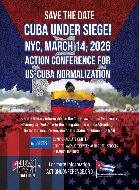Sunday February 22 12:30pm Vancouver For location call: 604-780-4029 Organized by: Friends of Cuba Against the U.S. Blockade - Vancouver In Solidarity with: Maratón Mundial de Amor por Cuba & Puentes de Amor Sponsored by: Vancouver Communities in Solidarity with Cuba – VCSC, Vancouver Communist Party of Canada Marxist-Leninist, Supporters of the Communist League in Vancouver, Fire This Time Movement for Social Justice – Vancouver, Mobilization Against War & Occupation (MAWO) – Vancouver March 14, 2026 Cuba Under Siege: An Action Conference Click Here For More Info! Organized by: U.S.-Cuba Normalization Conference Coalition PAST EVENTS & ACTIONS January 27, 2026 Monthly Webinar & Online Picket Voices from Venezuela: The People Want Peace & Justice January 25, 2026 Join The Vancouver Monthly Car Caravan To Lift The U.S. Blockade on Cuba!
