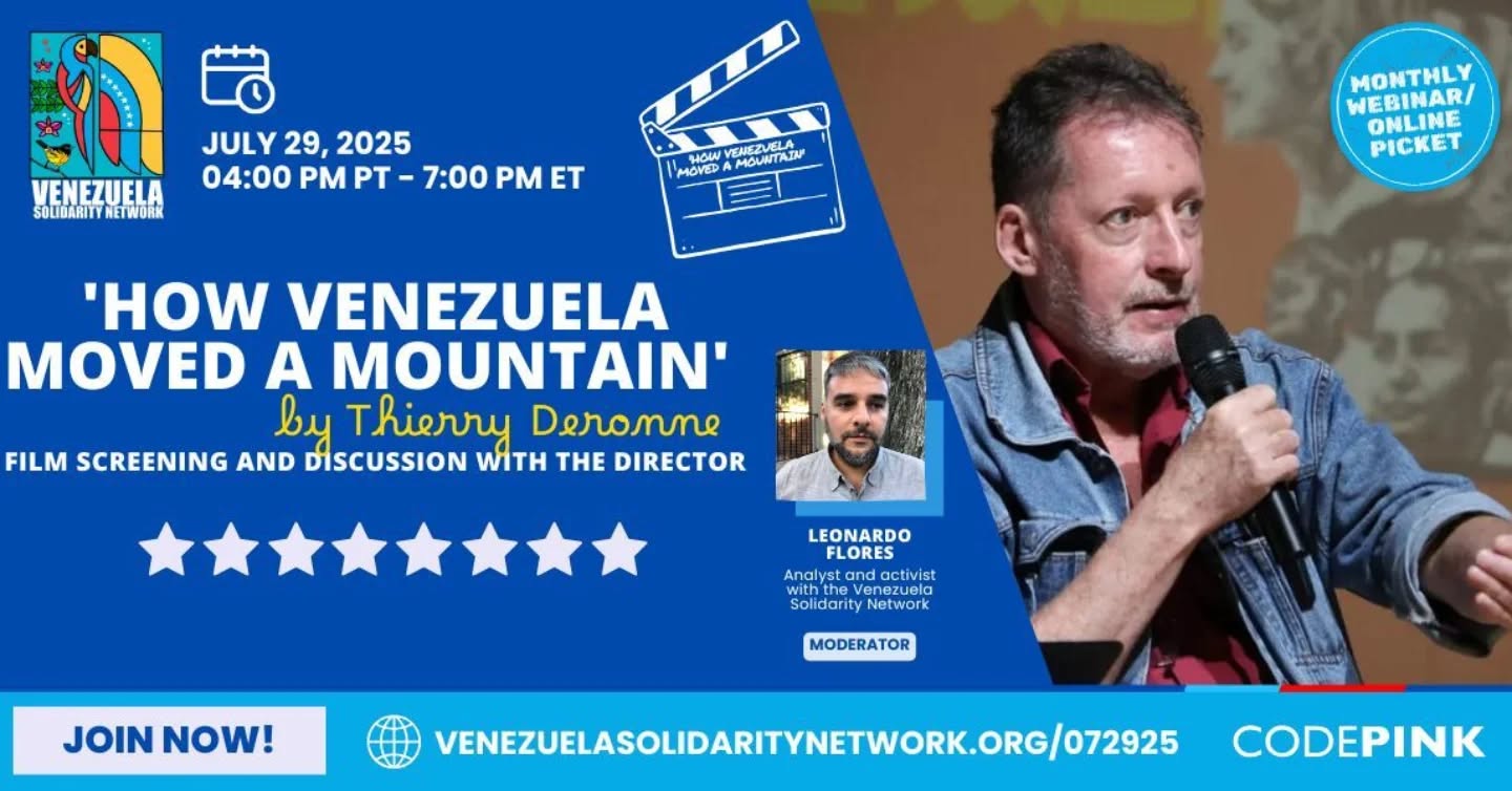 Click Here For Photos! Organized by: Friends of Cuba Against the U.S. Blockade - Vancouver In Solidarity with: Maratón Mundial de Amor por Cuba & Puentes de Amor Sponsored by: Vancouver Communities in Solidarity with Cuba – VCSC, Vancouver Communist Party of Canada Marxist-Leninist, Supporters of the Communist League in Vancouver, Fire This Time Movement for Social Justice – Vancouver, Mobilization Against War & Occupation (MAWO) – Vancouver August 7, 2025 Bi-Weekly Banner Drop for Palestine & Iran! US-Israel Hands Off Gaza & Iran! End Starvation & Genocide in Gaza! Ceasefire Now! End The Siege on Gaza Now! Stop Bombing Gaza! End the Genocide Now! No To Ethnic Cleansing! August 7, 2025 Bi-Weekly Banner Drop for Palestine & Iran! Stop Starving Gaza Now! End the Genocide Now! US-Israel Hands Off Gaza & Iran! End The Siege On Gaza Now! Stop Bombing Gaza! US/Canada Stop Arming Israel! July 31, 2025 From Our Hearts To Cuba Hearts Defend Cuba's health internationalism from the Trump administration's attacks! Click Here To Watch! For more information on the campaign: savinglives.us-cubanormalization.org July 29, 2025 Monthly Webinar & Online Picket 'How Venezuela Moved a Mountain' by Thierry Deronne Film Screening and Discussion with the Director July 27, 2025 Join The Vancouver Monthly Car Caravan To Lift The U.S. Blockade on Cuba!