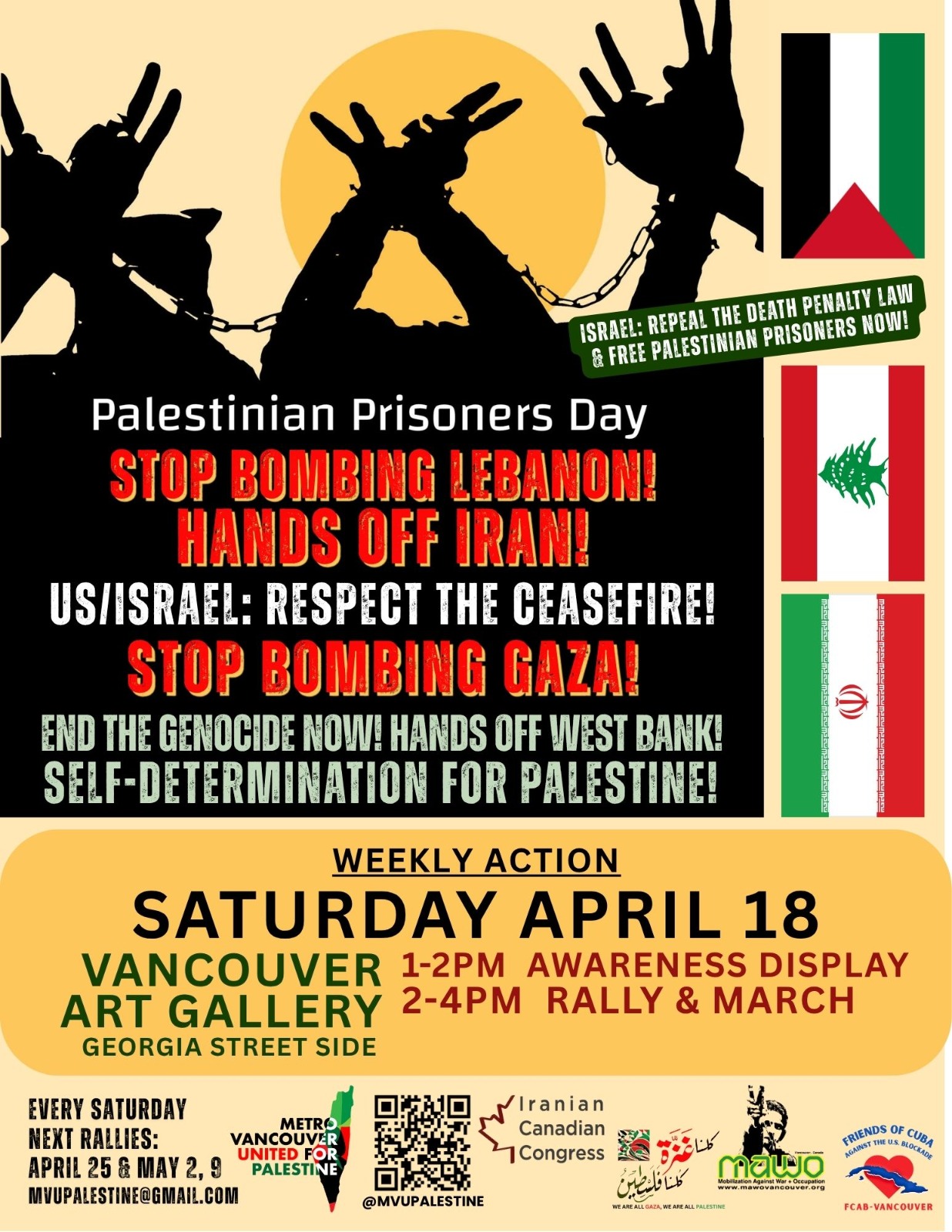 FIRE THIS TIME UPCOMING & RECOMMENDED EVENTS April 18, 2026 Weekly Action Palestinian Prisoners Day Israel: Repeal the Death Penalty Law! & Free All Palestinian Prisoners Now! Stop Bombing Lebanon! Hands Off Iran! US/Israel: Respect the Ceasefire! Stop Bombing Gaza! End the Genocide Now! Hands Off West Bank! Self-Determination for Palestine! Saturday April 18 Awareness Display 1-2pm Rally & March 2-4pm Vancouver Art Gallery PAST EVENTS & ACTIONS March 29, 2026 Join The Vancouver Monthly Car Caravan To Lift The U.S. Blockade on Cuba!